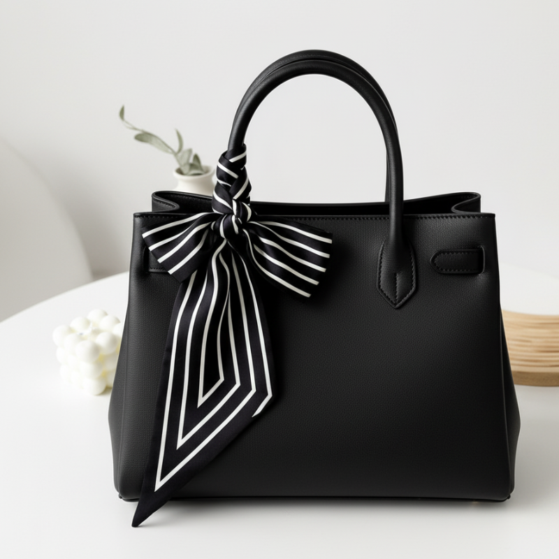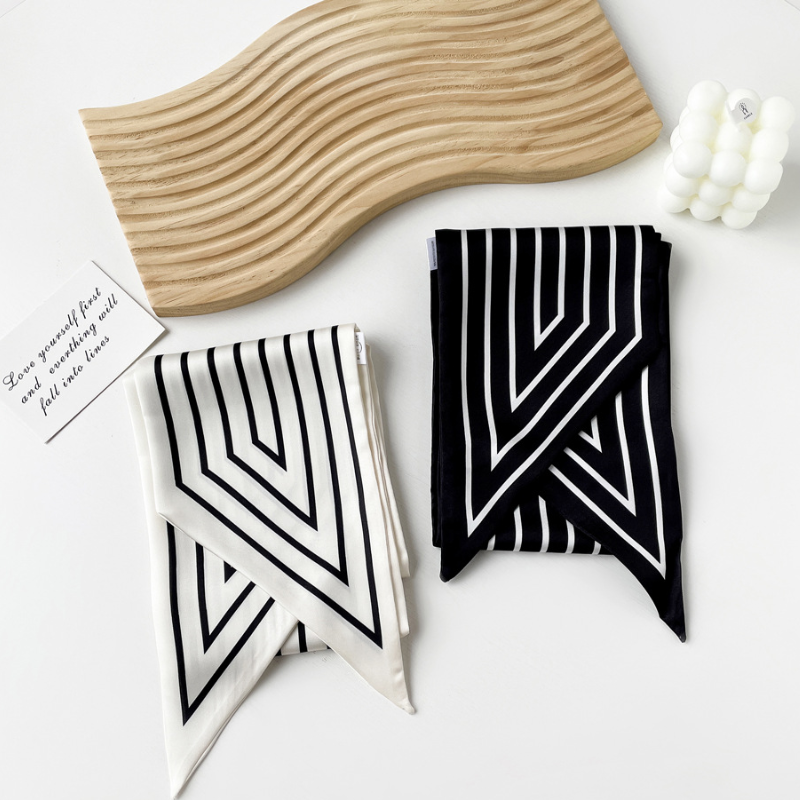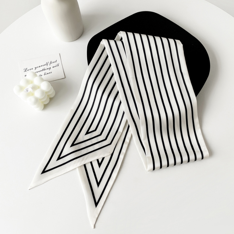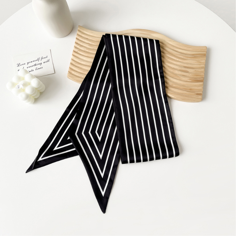 Elevate your style with the captivating Black and White Ribbon Bag Scarf. This luxurious artifitial silk scarf is designed to add an artistic touch to any look. Its versatile 145cm x 14cm size makes it perfect for adorning handbags, wrists, or hair with effortless elegance. Embrace a touch of free-spirited charm and transform your accessories.