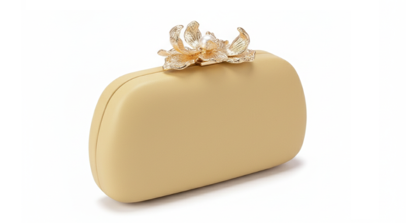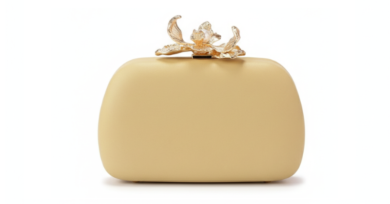 This exquisite clutch boasts a smooth, luxurious champagne-gold finish, providing a refined backdrop for its stunning focal point. It's adorned with a beautifully crafted metallic golden flower, delicately centered with a lustrous pearl, serving as both decoration and clasp. Perfect for weddings, formal dinners, or any special occasion, this bag adds a touch of timeless elegance and sophisticated artistry to your look.