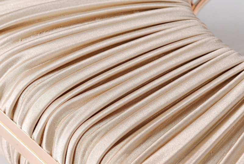 These elegant bags feature a beautifully ruched and pleated satin body, creating a sophisticated fan-like texture that catches the light. Each bag is adorned with a stylish circular ring handle and a subtle golden kiss-lock, blending modern design with classic charm. Available in captivating hues, they are perfect for evening events, adding a touch of refined grace to your attire.