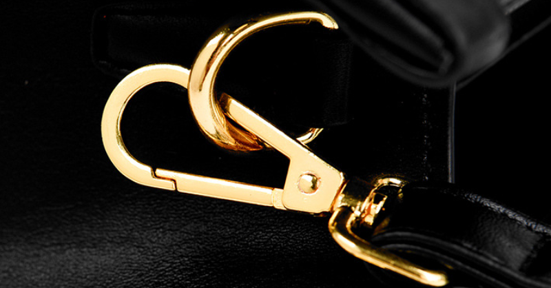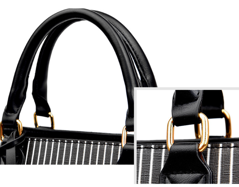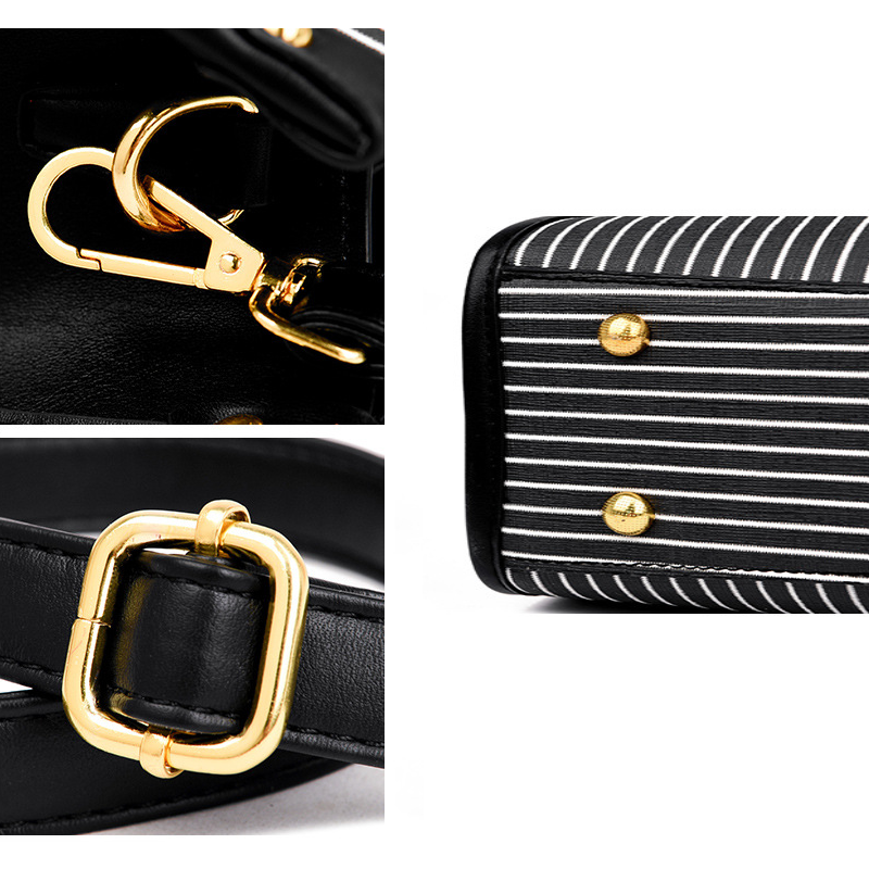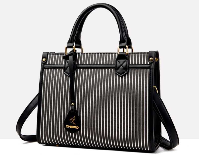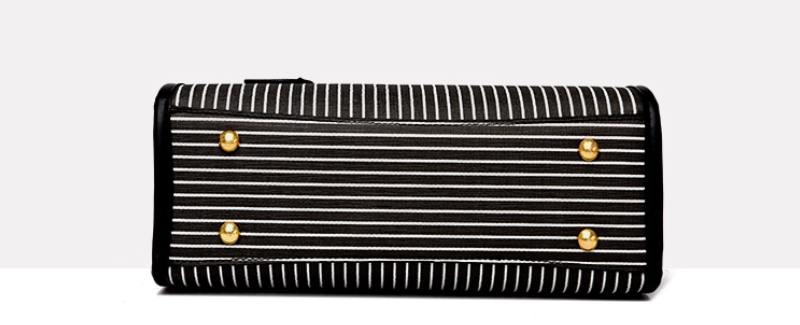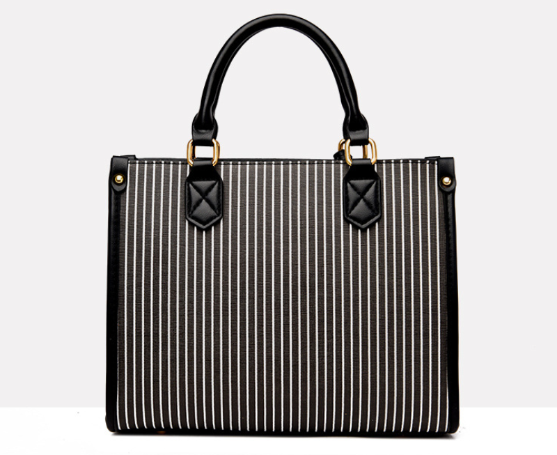 This sophisticated and stylish handbag features a striking vertical stripe design in contrasting black and white, offering a modern yet classic aesthetic. Crafted with a structured silhouette, it boasts sturdy top handles and elegant gold-tone hardware, including studs and buckle accents, that add a touch of luxury. The bag appears to be made from a durable material, likely faux leather or a similar high-quality synthetic, ensuring longevity.