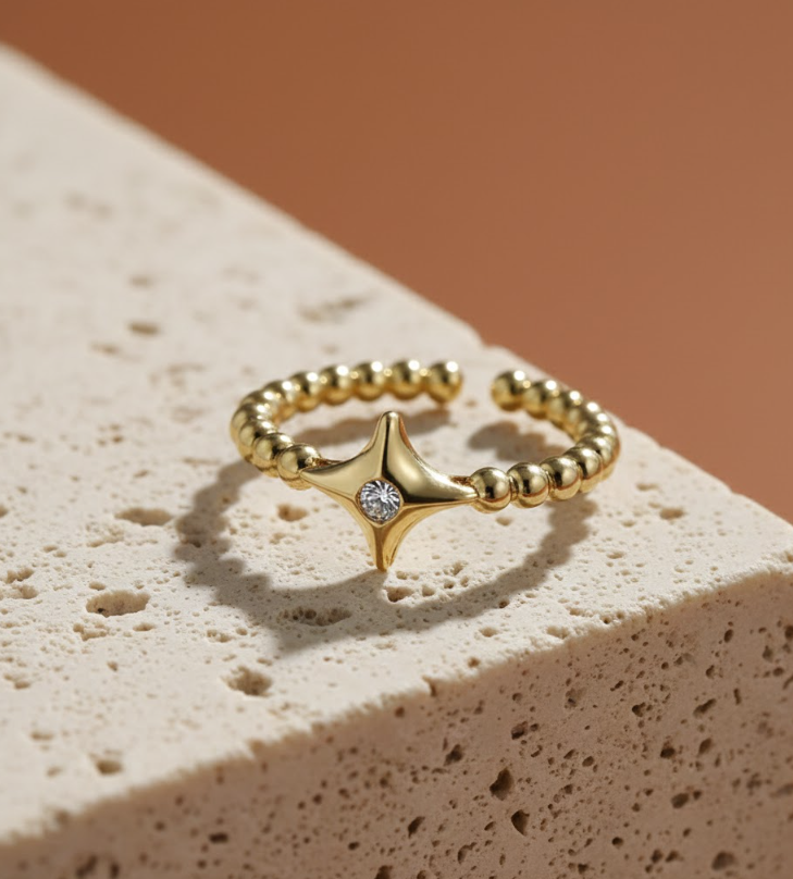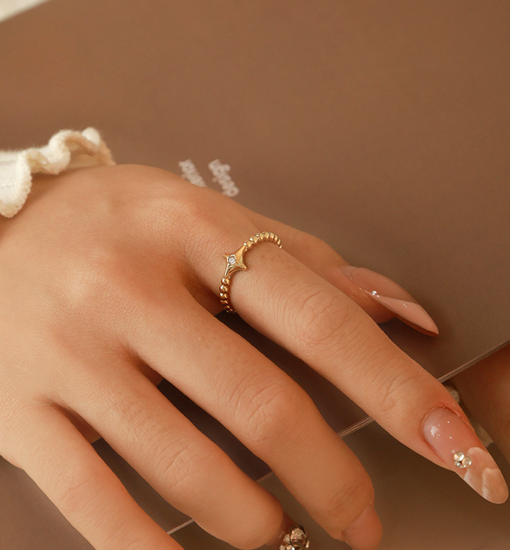 The Zircon Star Open Ring features a delicate star design inlaid with sparkling zircon stones, creating a simple yet high-end look. Its open-ring structure offers a comfortable and adjustable fit, making it suitable for everyday wear.